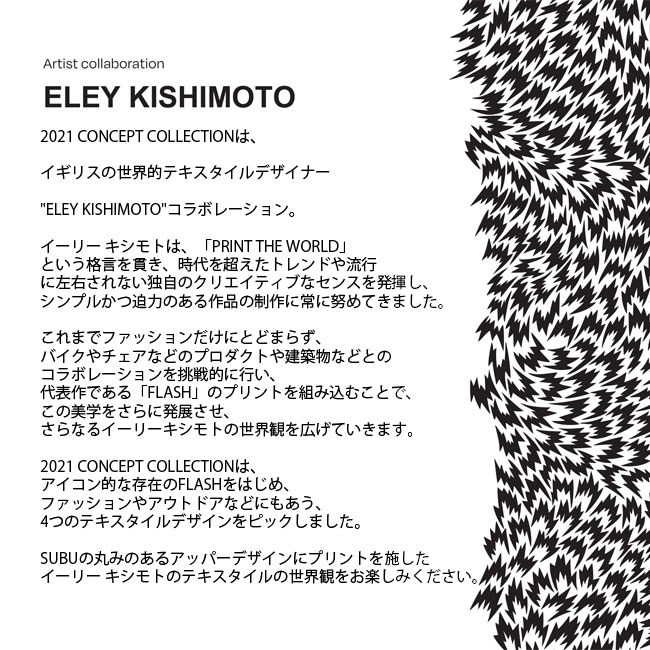 これまでファッションだけにとどまらず、バイクやチェアなどのプロダクトや建築物などとのコラボレーションを挑戦的に行い、代表作である「Flash」のプリントを組み込むことで、この美学をさらに発展させ、さらなるイーリーキシモトの世界観を広げていきます。