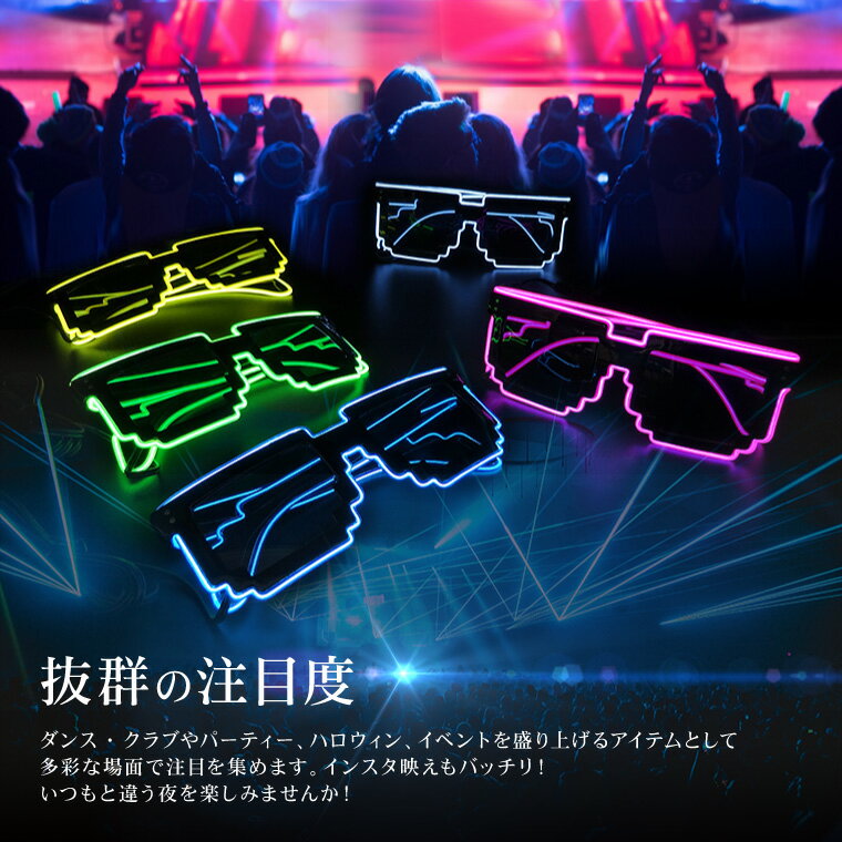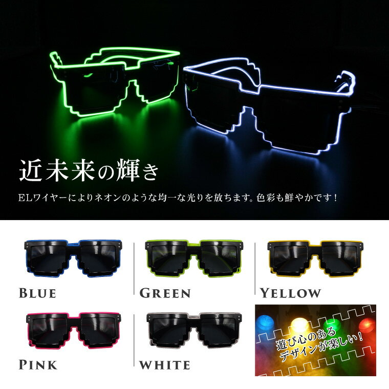光るサングラス ピクセル メガネ 電池ボックス付 全5色 EL ワイヤー LED サングラス パーティーグッズ おもしろ めがね 眼鏡 ハロウィン コスプレ ダンス 結婚式 余興 学園祭 衣裳 仮装 クリスマス フェス イベント クラブ