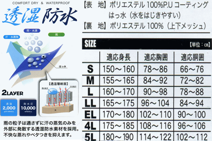 【機能、付属品】防水、撥水 、フード付、上下総裏メッシュ、胸ポケット、裾口調節スナップ、収納袋袖口アジャスター 、ズボン前ファスナー耐水圧:10000mm以上 透湿:2000mm 製品寸法(cm) サイズ 上着 ズボン 着丈 胸囲 裄丈 総丈 又下 腰囲 S 69 109 80 100 69 106 M 72 112 83 103 72 109 L 75 117 86 106 75 112 LL 78 122 89 109 78 115 EL 81 127 92 112 81 118 4L 84 133 95 115 84 124 新製品!☆