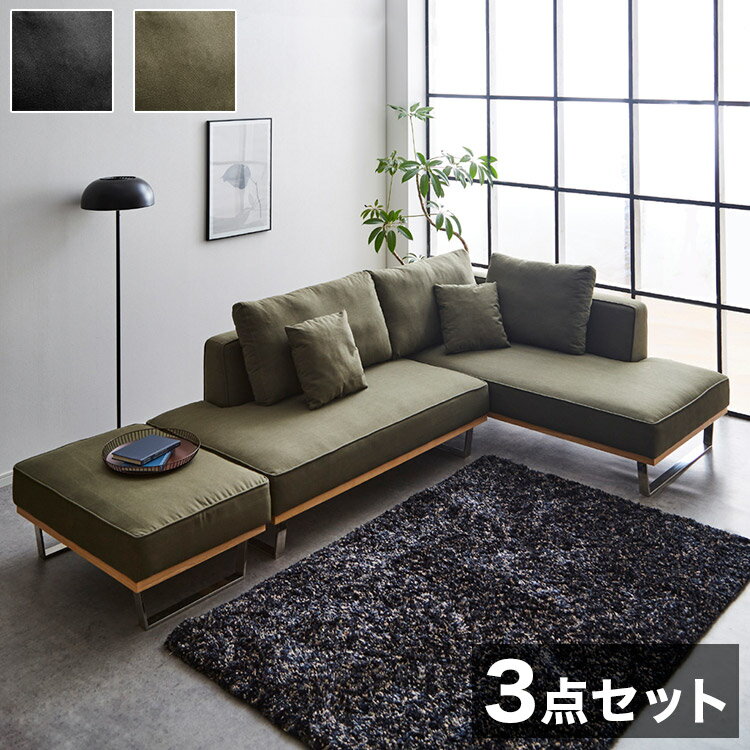 カウチソファセット 帆布生地 スチール脚 オットマン付き 高級感 ワイドカウチソファー キャンパス生地 モダン おしゃれ(代引不可)【送料無料】